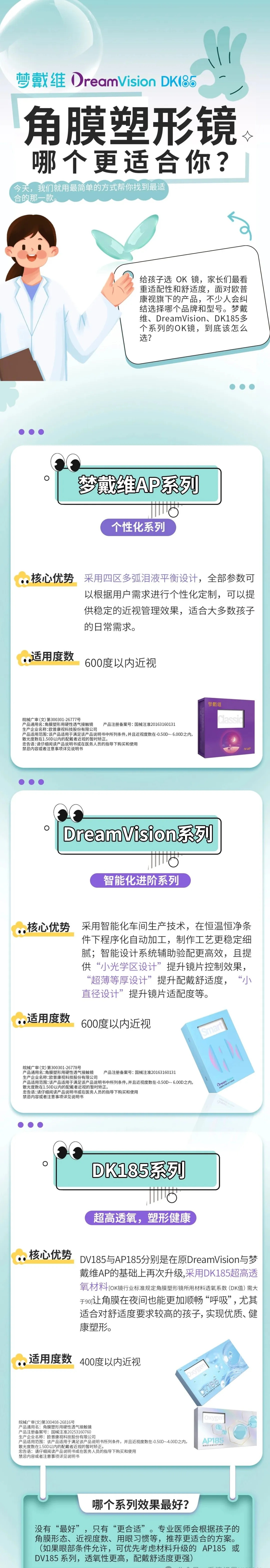 没有 “最好”,只有 “更合适”。专业医师会根据孩子的角膜形态、近视度数、用眼习惯等,推荐更适合的方案。(如果眼部条件允许,可优先考虑材料升级的 AP185 或 DV185 系列,透氧性更高,配戴舒适度更强)